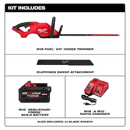 The M18 FUEL™ 24" Hedge Trimmer is compatible with all M18™ batteries. The hedge trimmer is optimized to be used and will see the best performance with M18™ REDLITHIUM™ HIGH OUTPUT™ and FORGE™ XC8.0 and HD12.0 batteries.