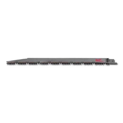 Our Pruning SAWZALL® Blades feature extra deep gullets for faster cutting. The MILWAUKEE® reciprocating saw pruning blade clears limbs, branches and green wood with 5 induction-hardened teeth per inch, providing long blade life. Our pruning saw blades have unique fleam ground teeth for clean cuts in both directions in wood, plywood, OSB and engineered lumber materials. These pruning blades for reciprocating saws are equipped with ½” universal tangs that fit all SAWZALL® Blades and thin kerfs for flexible cuts.