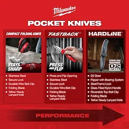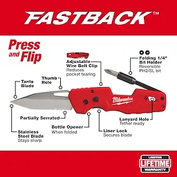 Our FASTBACK™ 5-in-1 Folding Knife features a press and flip mechanism providing you easy, one-handed opening. The folding knife has a stainless steel blade that stays sharp. The pocket knife also features a liner lock that secures the blade while also allowing you to easily close it when done. The 5-in-1 pocket knife has a folding tanto knife that is partially serrated for versatility, allowing you to both pierce and tear through material. The folding pocket knife also includes a fold-out 1/4" bit holder along with a reversible Phillips #2 and slotted 1/4" bit. It also has a built-in bottle opener providing you with added functionality. The pocket knife has a durable belt clip that reduces pocket tearing and includes a tether-ready lanyard hole.