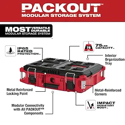 Part of the industry’s most versatile and most durable modular storage system, the Milwaukee PACKOUT™ tool box is constructed with impact resistant polymers and metal reinforced corners to provide up to 75lbs of weight capacity and ultimate durability in harsh jobsite conditions. Featuring an IP65 rated weather seal to keep out rain and jobsite debris, and integrated organizers bins, the Milwaukee PACKOUT™ tool box is the fully compatible with all Milwaukee PACKOUT™ modular storage products.