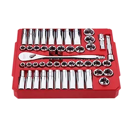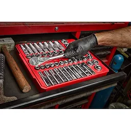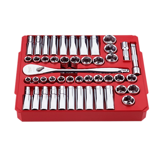 Our 46-Piece SAE & Metric 1/2" Drive Ratchet and Socket Set offers better access in tight spaces and maximum tool strength. The 90-tooth ratchet tool offers 4°of arc swing and a slim profile design, so you can work in tighter spaces. The MILWAUKEE® socket set features an innovative wrench-compatible socket design with FOUR FLAT™ sides to help prevent rolling. The ½” drive ratchet has sockets with sizes laser engraved into the flats for easy-to-read visibility. Our optimized socket geometry additionally helps reduce bolt rounding and stripping. The Milwaukee ratchet and socket set includes a removable inner designed to be stored long-term in a steel storage chest and a durable carrying case for ultimate portability. The set's accessories guarantee you have what you need to tackle every job, both in the garage and on the jobsite. The 46 Piece SAE & Metric ½” Drive Ratchet and Socket Set is backed by a lifetime guarantee.