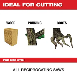 Designed with Carbide teeth for longer life vs. bi-metal blades in clean wood, branches, and root applications