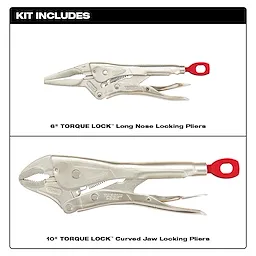 Our 2-Piece TORQUE LOCK™ Locking Pliers Set provides you with faster tool setup and more locking force. The locking pliers' unique thumb screw provides you with a more convenient geometry for hand force while providing clearance to generate more torque with the screwdriver through-hole design. The pliers' hardened jaws give you increased gripping power and they are made of forged alloy steel for maximum durability, perfect for the toughest of job sites. The pliers feature efficient and easy one-handed control release with ergonomic handles with an anti-pinch design. We stand behind our product and offer a MILWAUKEE® Limited Lifetime Warranty with all our locking tools. The two-piece set includes one 10" TORQUE LOCK™ Curved Jaw Locking Pliers and one 6" TORQUE LOCK™Long Nose Locking Pliers.