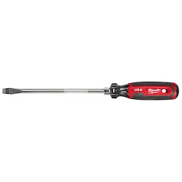 Our Milwaukee® Cushion Grip Screwdrivers (USA) are manufactured to give the professional the best-fitting screwdriver with max grip. Our screwdriver tips are custom machined to deliver a precise fit and reduce stripping during demanding fastening applications. For added confidence, the tips are laser etched to increase the gripping surface. Manufactured with high-strength boron-infused steel for increased hardness, our screwdrivers stand up to the demands of the site with ultimate durability and life. Providing increased versatility, select screwdrivers include a wrench-ready bolster for added torque and a knurled shank for precision control. Quick identification markings on the handle make it easy to identify screwdriver tip size and type, including Phillips, cabinet, ECX, slotted, and square. The demolition screwdrivers also include a hammer-ready strike cap. Our screwdrivers range in shank sizes from 3-inch to 10-inch. Our Milwaukee Cushion Grip Screwdrivers (USA) are made in the USA with best-in-class manufacturing technology and USA-sourced materials all backed by a complete Lifetime Guarantee.