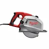 Milwaukee's 8" Metal Cutting Circular Saw delivers faster, cooler, cleaner, more affordable metal cutting. Forget the showers of hot metal chips and sparks that were once an aerial threat on metal construction jobsites. The 6370 shears the metal, producing a virtually spark-free wake and cool, burr and scorch-free edges that don't require post-cut finishing. Cool cut waste, in the form of metal shavings, is effectively contained with a durable magnesium blade shield and channeled into the saw's integral ChipTank. Cool cutting also means that materials can be handled almost immediately following a cut, reducing downtime. Driven by a powerful 15 amp (1-3/4 max HP), 3,700 RPM motor and equipped with a full grill of razor-sharp, cermet-tip teeth, the 6370 tears through tough cuts without hesitation. Count on up to 10 gauge sheets and 1/4 in. steel plate cuts, all day, every day. More extreme cuts, even up to 3/4 in. steel plate, are possible when proper operating techniques are used. Any way you slice it, cold cutting metal means value. Internal test results indicate that our new metal cutting blades last a minimum of 25 times a standard abrasive wheel. Specially-formulated cermet tip metallurgy and tooth geometry ensure these incredible blades cut faster, stay sharp longer, and resist more impacts. Translation? A significantly lower cost per cut ($0.20 versus $0.60), not to mention the savings associated with 1 versus 25 blade changes. To keep on target, the new 6370 features a set of on-board sight-line and blade point-of-entry indicators along with a slot in the saw's shoe for a rip fence. It is also the first and only corded metal cutting saw to feature a lower guard retraction lever. Plunge cuts, a frequent challenge for metal roofing contractors, are fast and furious with this exciting new tool. The lever's location, adjacent to the side handle, ensures that the user has both hands firmly on the saw throughout the cut. Beyond its capacity to cut solid, thicker gauge materials, the 6370, with a 2-9/16 in. cut-depth, screams through most corrugated metal roofing and decking sheets, structural, shape, grating and framing materials in one-pass. Insufficient cut depth means material must be flipped over and re-cut, usually a two-man operation. To ensure a smooth ride, the new 6370 is equipped with a set of serious comfort features. The tool's rear and side handles feature soft, tactile gripping surfaces and are designed to comfortably fit any user's hands. The side handle is canted forward to reduce wrist strain as well as wrapped completely to the motor housing, offering maximum comfort and control in any cutting orientation. Down-time is lost time so we've added valuable, time-saving features to the 6370. Removing the blade shield to discard cut waste or change blades is effortless with our exclusive, quick-release shield buckle. The remaining saw controls are conveniently located to ensure fast, effortless operation before, during and after the cut.