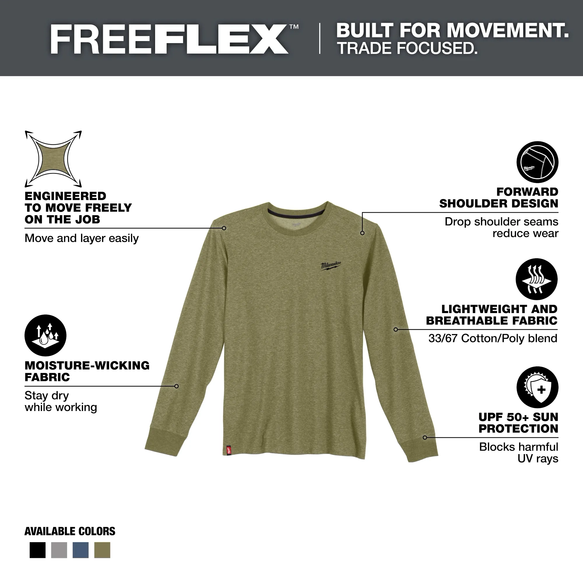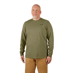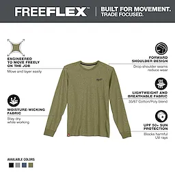 Part of the MILWAUKEE® FREEFLEX™ Collection, our Long Sleeve Hybrid Work Tee is BUILT FOR MOVEMENT. Our Long Sleeve Hybrid Work Tee is a lightweight and breathable solution that allows you to STAY COMFORTABLE and KEEP COOL. This work t-shirt is specifically created for mobility and durability with its drop shoulder design to reduce wear on the seams. The MILWAUKEE® Hybrid Work Tee Shirts are built to protect against the elements, offering UPF 50 protection for those warm days on the jobsite and moisture-wicking fabric so you can stay dry while working. Choose from a variety of colors, including black, blue, gray, and green, available in sizes small to 3XL.