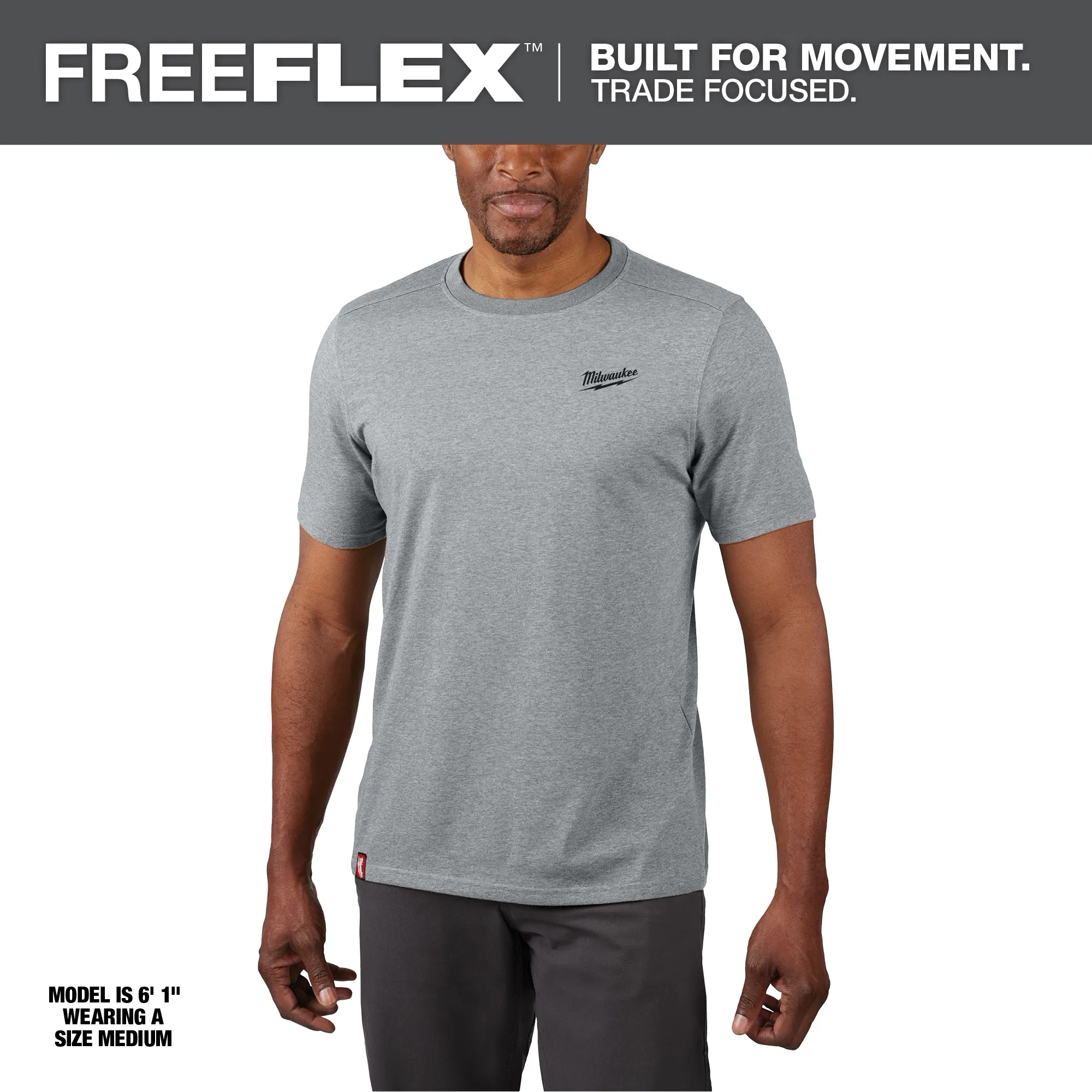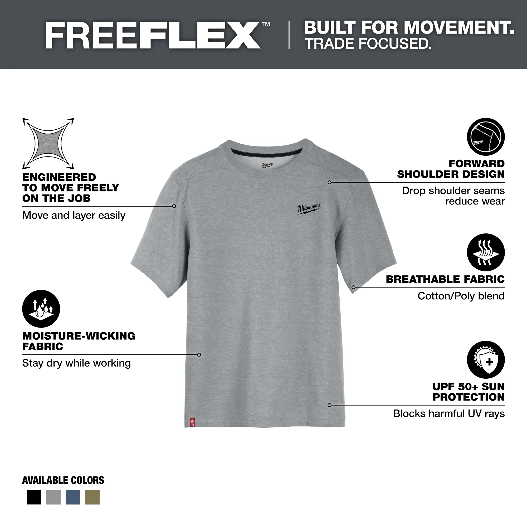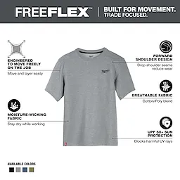 Part of the MILWAUKEE® FREEFLEX™ Collection, our Short Sleeve Hybrid Work Tee is BUILT FOR MOVEMENT. Our Short Sleeve Hybrid Work Tee is a lightweight and breathable solution that allows you to STAY COMFORTABLE and KEEP COOL. This work t-shirt is specifically created for mobility and durability with its drop shoulder design to reduce wear on the seams. The MILWAUKEE® Hybrid Work Tee Shirts are built to protect against the elements, offering UPF 50 protection for those warm days on the jobsite and moisture-wicking fabric so you can stay dry while working. Choose from a variety of colors, including black, blue, gray, and green, available in sizes small to 3XL.