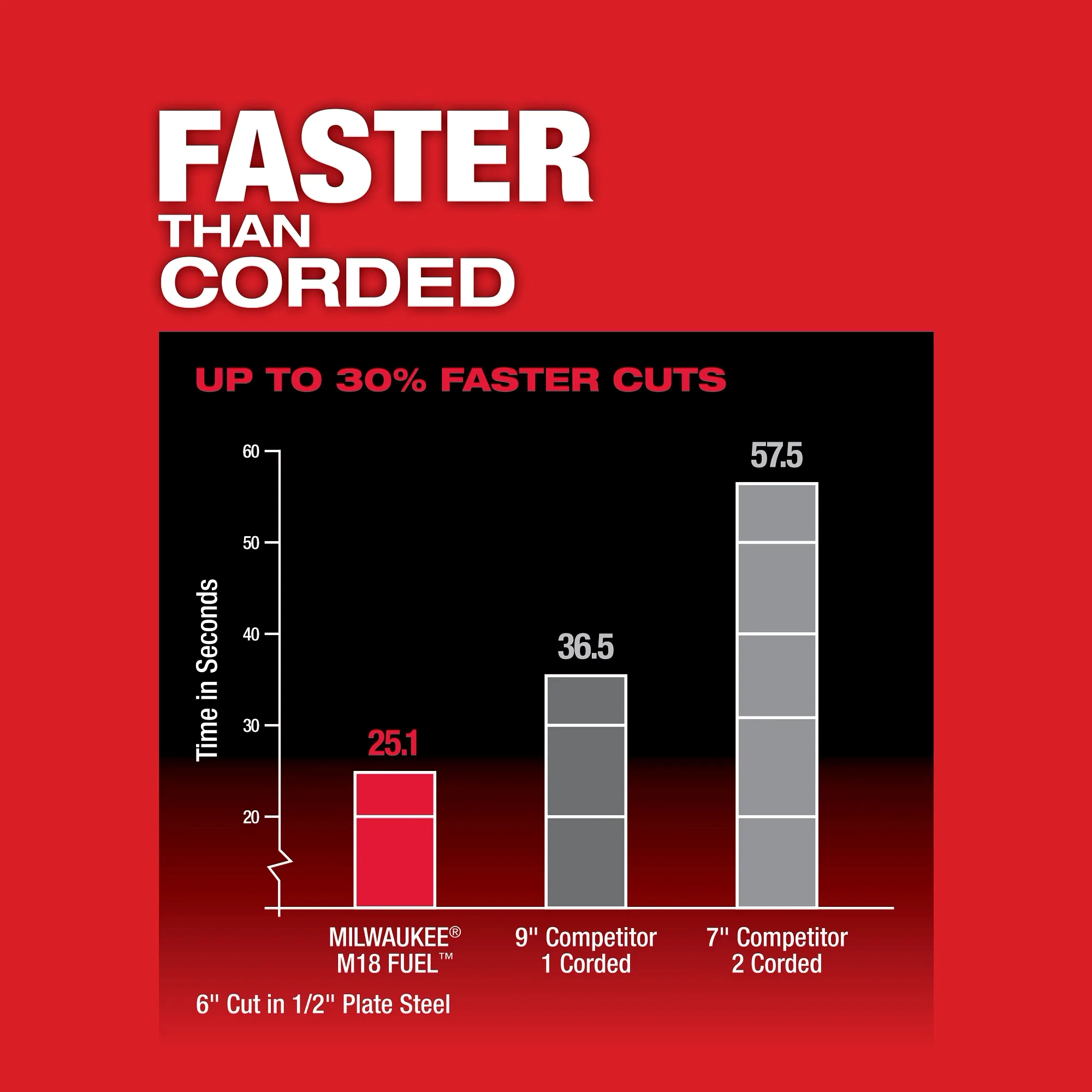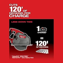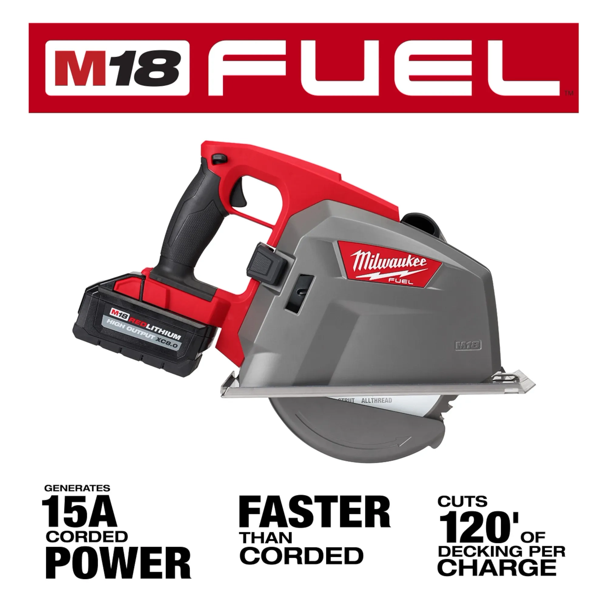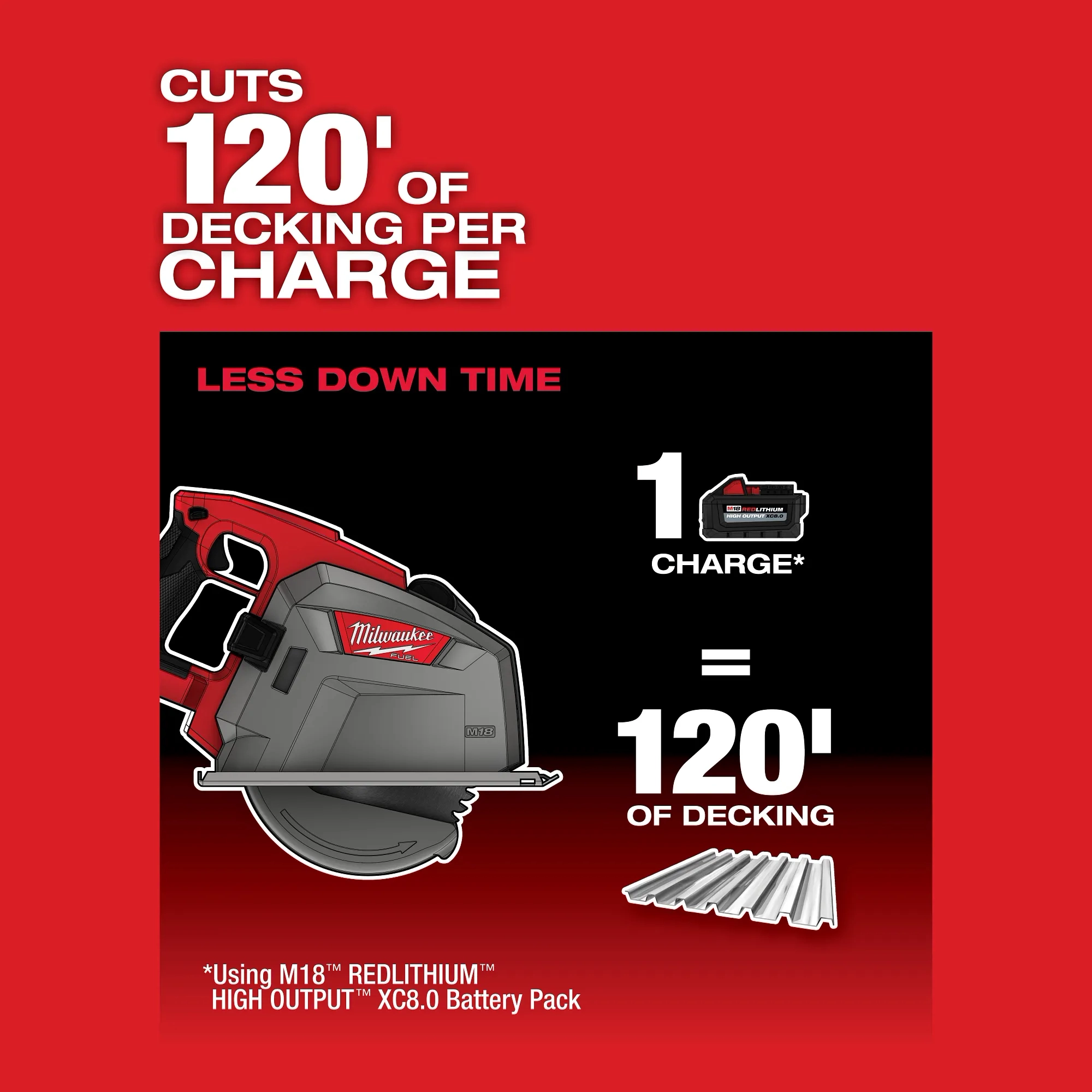 Our M18 FUEL™ 8” Metal Cutting Circular Saw Kit generates 15A corded power, faster cuts than 15A corded metal circular saws, and delivers up to 120’ of cutting corrugated decking per charge. We’ve designed our M18 FUEL™ 8” Metal Cutting Circular Saw to perform in the toughest applications, combining our legendary performance and durability with the portability of the M18™ platform. Our POWERSTATE™ Brushless Motor provides 4,000 RPM and faster cutting performance than its corded competitors. REDLINK PLUS™ Intelligence ensures maximum performance and protection from overload, overheating, and over-discharge. When paired with our M18™ REDLITHIUM™ HIGH OUTPUT™ XC8.0 battery, you get 50% more power while running 50% cooler than our M18™ REDLITHIUM™ XC Batteries. With a cut capacity of 2-9/16” for demanding applications, this Milwaukee 8” Circular Saw performs at a larger capacity than any previous cordless metal cutting circular saws.