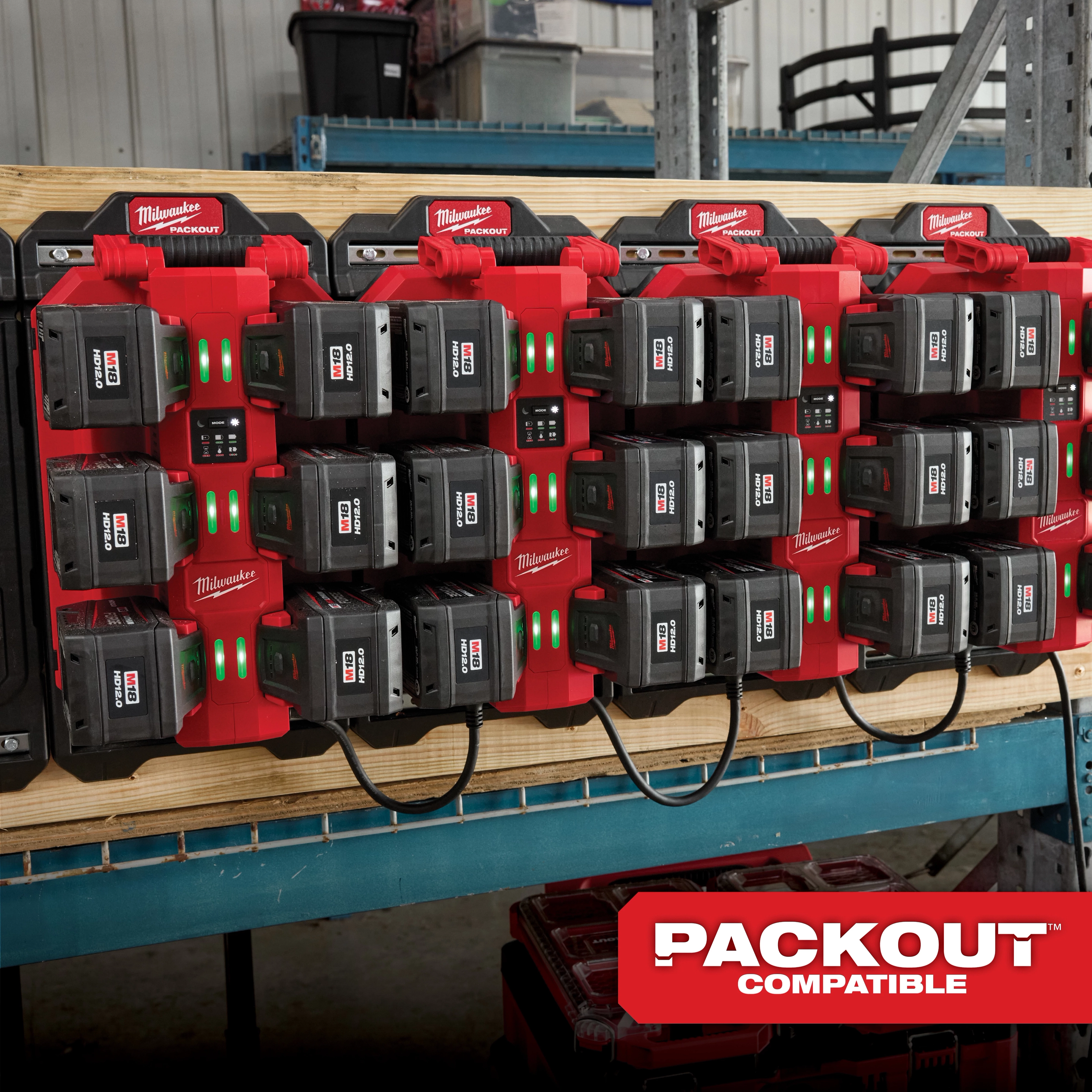 Our M18™ Six Bay Daisy Chain Rapid Charger w/ PACKOUT™ Compatibility is the most versatile shop-to-mobile charging solution. The Six Bay Daisy Chain Rapid Charger features dual charge modes for optimized rapid daytime or overnight charging. For bulk M18™ battery charging, 10 chargers can be daisy-chained together to recharge 60 M18™ packs overnight, all on a single 15A circuit. For daytime charging, rapid mode charges M18™ batteries at a 2X faster rate than standard chargers and will charge two batteries simultaneously, getting you back to work faster. Spend less time swapping batteries on the jobsite by managing six batteries in a consolidated portable charging experience. This M18™ battery charger is optimized for transportation and designed for charging on the go. The M18™ Daisy Chain Rapid Charger is PACKOUT™ compatible and can be integrated into shop or mobile spaces using the PACKOUT™ Wall Plates or transported to sites on your PACKOUT™ stack or the convenient carry handle. The M18™ Six Bay Daisy Chain Rapid Charger provides crews and users with the optimal charging experience for their bulk M18™ battery charging needs.