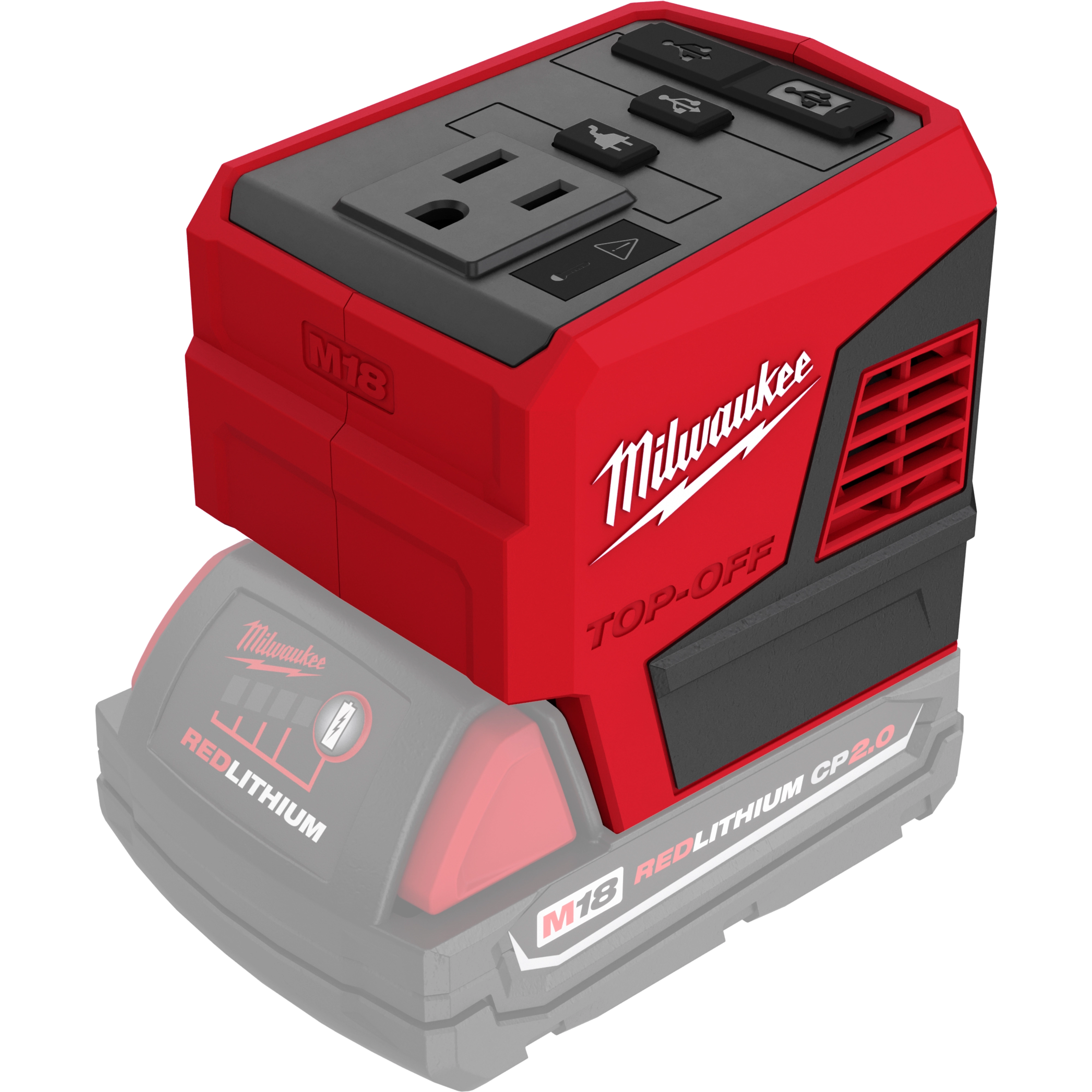 Our M18™ TOP-OFF™ 175W Power Supply delivers faster simultaneous power to personal devices and small electronics. Attach any M18™ battery to provide continuous power or recharge devices with (1) AC 120V outlet, (1) USB-C PD port, and (1) USB-A port. You can quickly charge up to three devices at the same time, without the barriers of speed throttling. With the USB-C PD port (45W), this battery inverter is capable of recharging devices, from a fully depleted state to 80% capacity, up to 75% faster than conventional wall chargers (5W). The MILWAUKEE® compact portable power supply has an attached metal rafter hook that can be extended to hang it from carts, lumber, or other jobsite materials when worksurface space is limited. You can instantly set up a mobile workstation or keep electronics securely within eyeshot, rather than making frequent trips to a wall outlet.