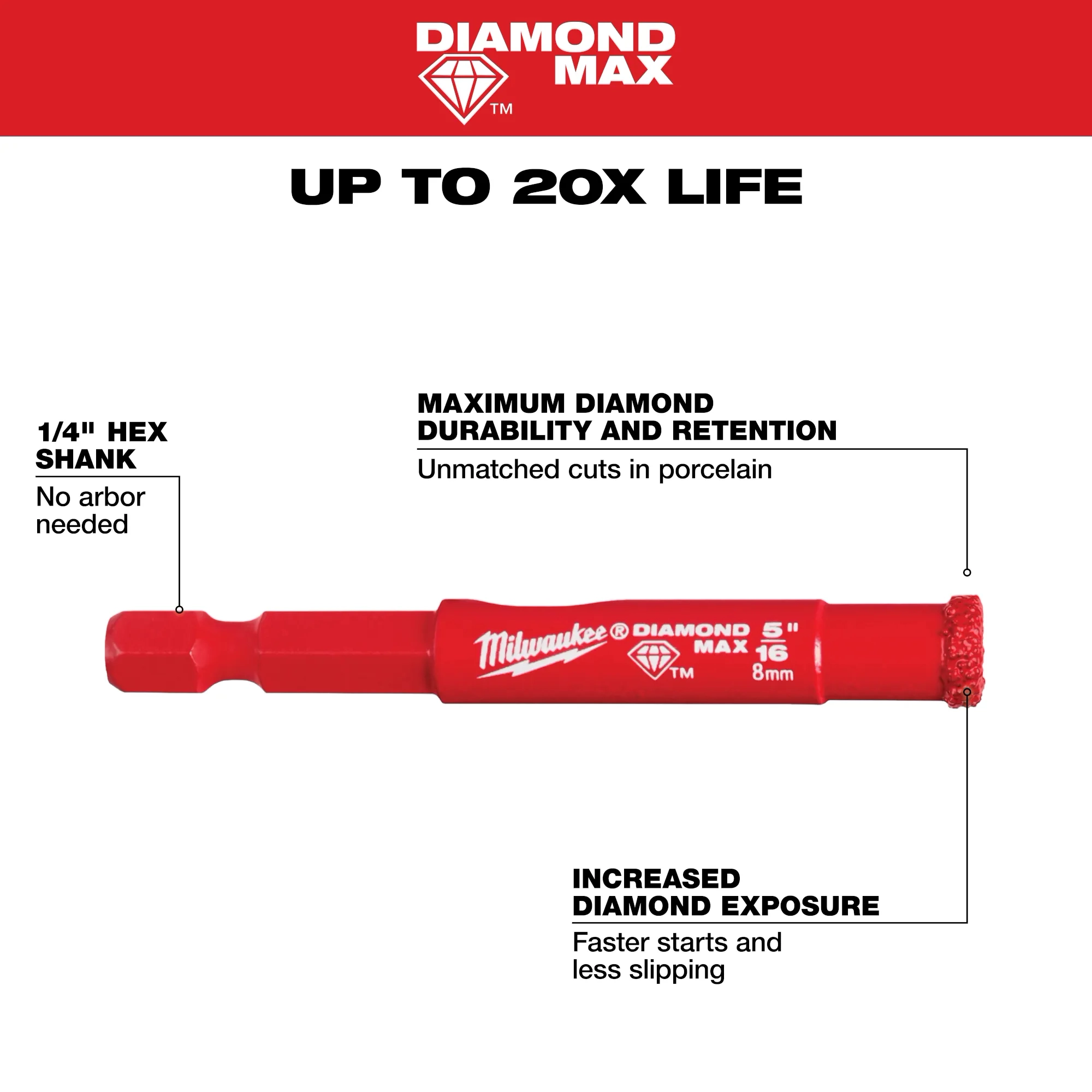 The MILWAUKEE® 5/16" Diamond MAX™ Hole Saw delivers up to 10X longer life when cutting tile, stone, and glass. Diamond MAX™ Hole Saws offer best-in-class performance, with higher grade diamonds for maximum heat and fracture resistance. An improved continuous brazed edge provides clean, superior joint strength, and better diamond retention when cutting hard, abrasive materials. The One-Piece Hole Saw has a 1/4" quick-change hex shank and features a large slug ejection slot. Designed as the single cutting solution for all tile, stone, and glass applications, Diamond MAX™ offers the lowest cost-per-hole on the market.