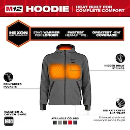 Our M12™ Heated Hoodie delivers HEAT BUILT FOR COMPLETE COMFORT. Powered by Milwaukee’s NEW HEXON HEAT TECHNOLOGY™, this hoodie STAYS WARMER FOR LONGER in all temperatures, delivers the FASTEST HEAT UP TIME and offers the GREATEST HEAT COVERAGE throughout the garment. Whether facing freezing outdoor temperatures or navigating spaces with minimal heat indoors, this hoodie adapts to its environment to deliver effective heat in any condition. By integrating HEXON HEAT TECHNOLOGY™ and an improved fabric design, optimal comfort and mobility are achieved. With ground-up developed cotton/polyester fleece fabric, this MILWAUKEE® hoodie provides warmth and a full range of motion whether worn as a mid-layer or exterior layer. The hidden battery pass-thru pocket allows for front or back battery placement, increasing versatility depending on the situation. Our Milwaukee® Heated Gear is developed in collaboration with feedback from users across the trades through continuous jobsite research.