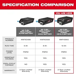 Our MX FUEL™ REDLITHIUM™ FORGE™ HD12.0 battery pack delivers up to 2x more runtime, has COOL-CYCLE™ capability for high-speed cooling, and the longest life versus REDLITHIUM™ batteries. REDLITHIUM™ FORGE™ are our most powerful, fastest charging, and longest life batteries. With 2X more runtime vs. MX FUEL™ REDLITHIUM™ XC406 (XC6.0), this battery delivers more work per charge allowing you to run your equipment longer and keep up with HIGH DEMAND™ applications. When paired with our MX FUEL™ Super Charger this battery charges in just 65-minutes to 100%. The MX FUEL™ REDLITHIUM™ FORGE™ HD12.0 is COOL-CYCLE™ capable. COOL-CYCLE™ Active Cooling System, provides high-speed cooling for less downtime. The active cooling feature works with MX FUEL™ batteries that have COOL-CYCLE™ capability. This battery pack delivers longest life for the most recharges and best performance over the life of the pack. The HD12.0 battery has the best protection from jobsite, weather, and environmental conditions. With ONE-KEY™, track, manage and secure equipment from your mobile device or computer using the industry’s largest Bluetooth® community tracking network. If ever lost or stolen, prevent tampering with remote lockout capability. REDLINK™ Intelligence allows the battery to communicate with MX FUEL™ equipment in application to optimize performance. This battery is fully compatible with all MX FUEL™ equipment and chargers.
